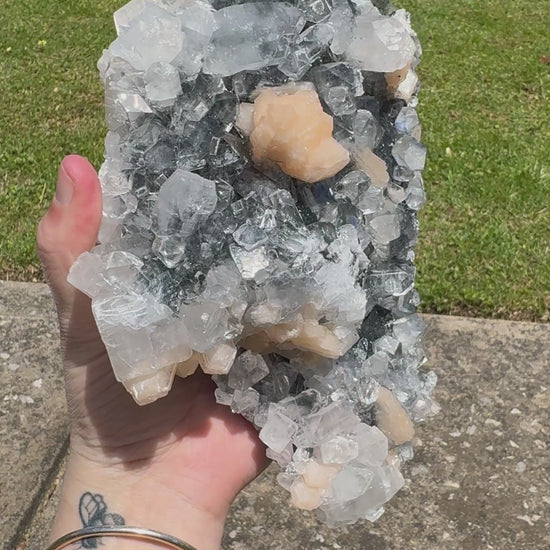 Sparkling Apophyllite crystals shimmer across the surface like starlight, uplifting your spirit, clearing the mind, and connecting you to higher guidance and truth.