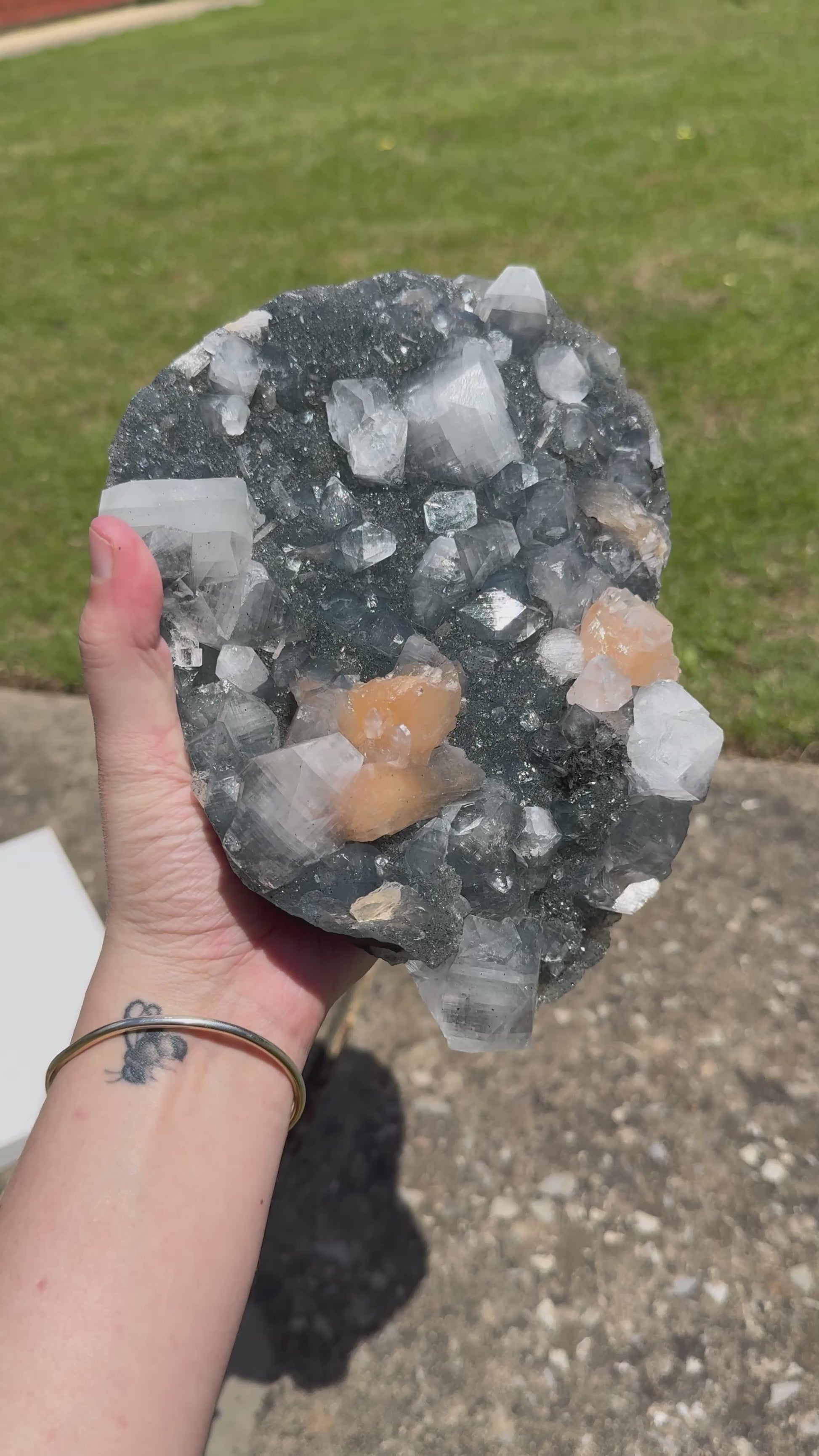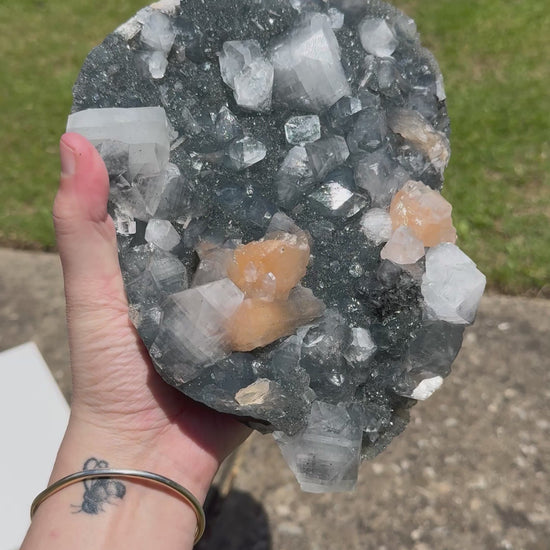 Sparkling Apophyllite crystals shimmer across the surface like starlight, uplifting your spirit, clearing the mind, and connecting you to higher guidance and truth.