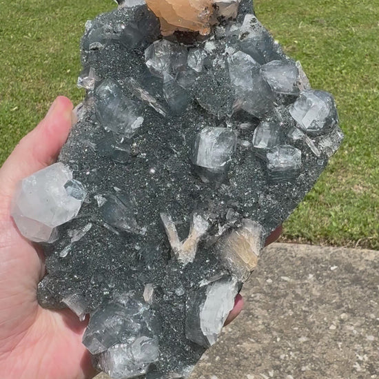 Sparkling Apophyllite crystals shimmer across the surface like starlight, uplifting your spirit, clearing the mind, and connecting you to higher guidance and truth.